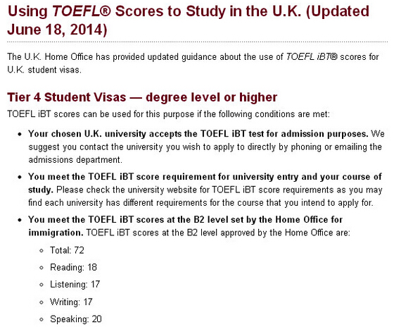 据悉,今年4月,美国教育考试服务中心(ETS)不再与英国内政部续签安全英语语言测试(SELT)许可。因此,自2014年4月17日起,托福不再作为英国内政部认可的英语考试。但在满足上述条件情况下,4月17日之后取得的托福成绩仍可用于申请英国Tier 4第四层级(普通类)学生签证。
