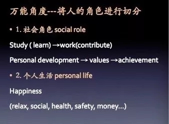 上图是万能角度其中的一个思考方式,就是将人的角色进行切分。其实每一个人从读书开始都会承担两种角色,社会角色和个人角色。社会角色就是每一个人从开始读书,不断地处于keep learning的过程。那我们毕业了之后,就需要去参与工作,那工作就是在贡献的过程,而这整个过程当中,我们其实都在经历一件事情——个人发展和成长,不断地增加自己的价值,而我们最终的目的是为了获取achievement。