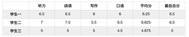 雅思与托福不同,雅思最终分数由四项分值相加求平均所得,最后分数以0.5分为一个梯队,四舍五入进分制而得,以最接近的整分或半分报告。可参考下图:
