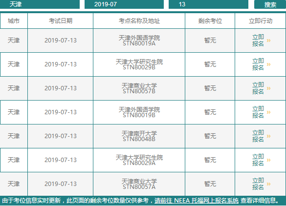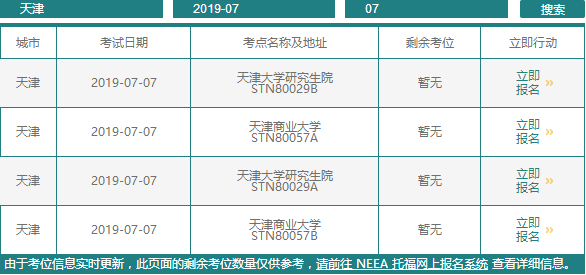以上就是为大家整理的“天津托福考位查询:2019年7月托福剩余考位情况”,更多精彩内容请关注新东方在线托福频道!