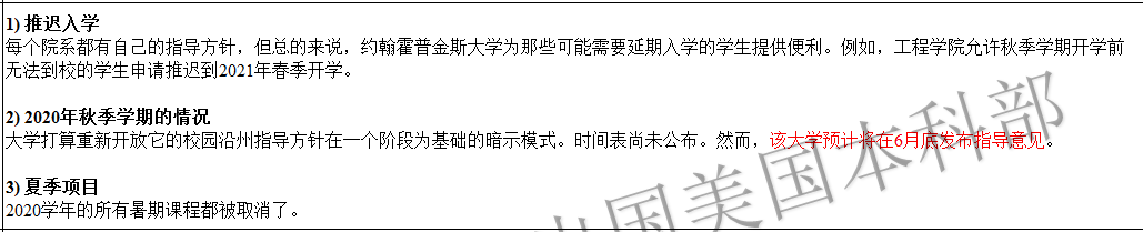 以下是美国大学2020秋季开学政策汇总:约翰霍普金斯大学(截止6月12日):