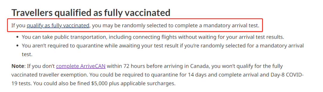 需要注意的是,如果未在抵达加拿大前72小时内完成ArriveCAN,则将没有资格获得完全接种疫苗的旅行者豁免。对于这一类入境者,会被隔离14天,在抵达时进行新冠检测并在8天后再进行检测,同时有可能被罚款$5,000。