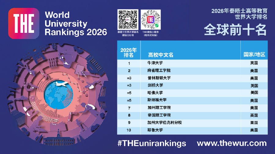 10月9日,泰晤士高等教育(THE)发布了2026年世界大学排名的结果。2026年泰晤士高等教育世界大学排名涵盖115个国家/地区,共有2,191所高校上榜,再创历史新高。